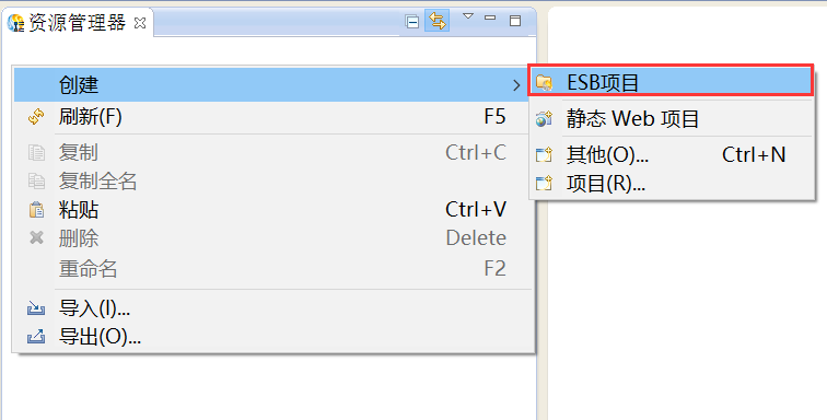 2. 在资源管理器中,鼠标右键选择“创建 > ESB项目”,创建ESB项目,如下图所示。