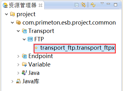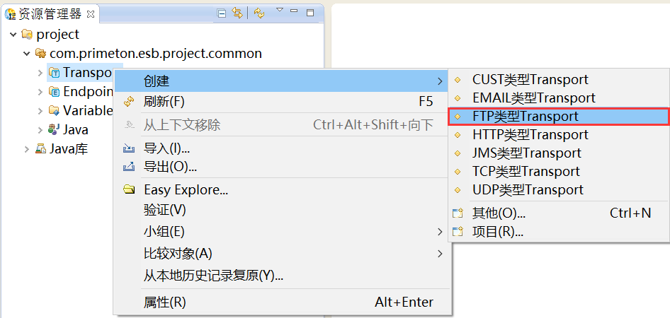 1. 在创建的ESB项目的“Transport”上,右键选择“创建 > FTP类型Transport”,如下图所示。
