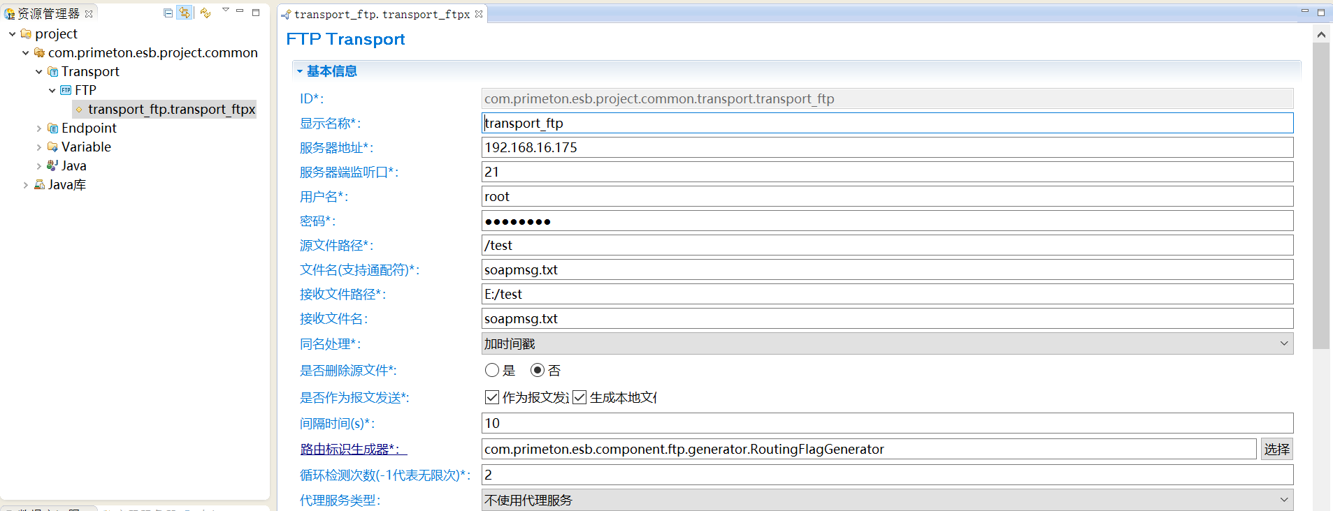 4. 在资源管理器中,双击创建的FTP Transport,打开FTP Transport编辑器,修改相关参数。如下所示。