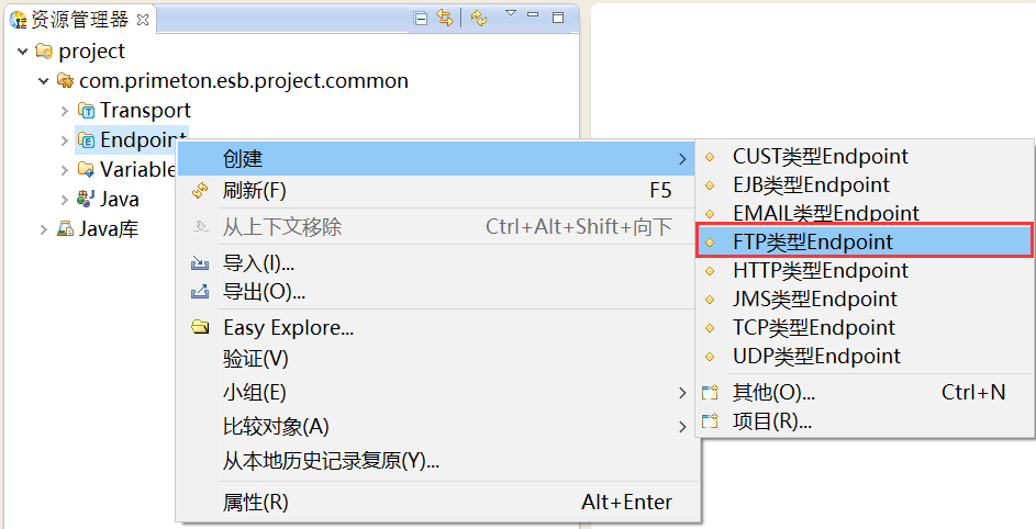 1. 在创建的ESB项目的“Endpoint”上,右键选择“创建 > FTP类型Endpoint”,如下图所示。