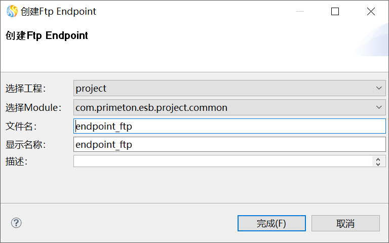 2. 在弹出的“创建Ftp类型Endpoint”界面,选择当前的工程、Module,并输入文件名及显示名称,如下图所示。