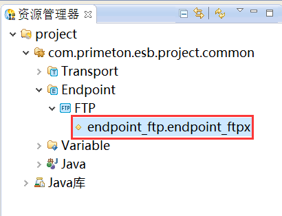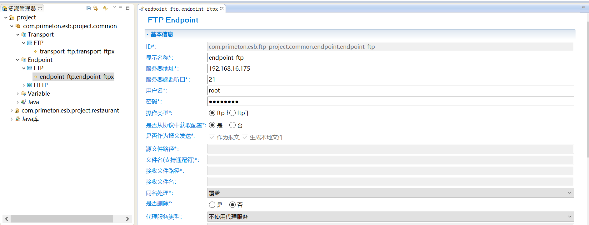 4. 在资源管理器中,双击创建的FTP Endpoint,打开FTP Endpoint编辑器,修改相关参数。如下所示。