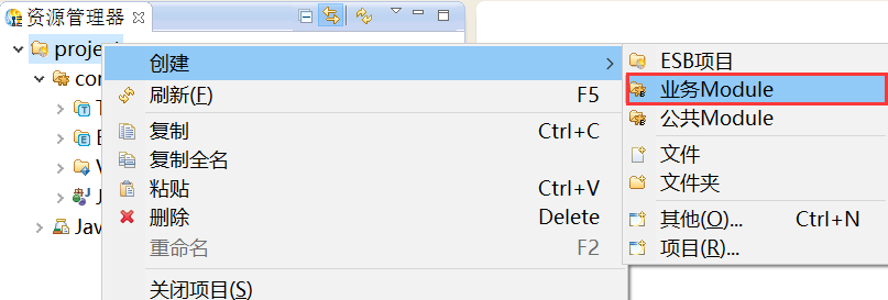 1. 在资源管理器中,选中创建好的项目,鼠标右键选择“创建 > 业务Module”,创建业务Module,如下图所示。