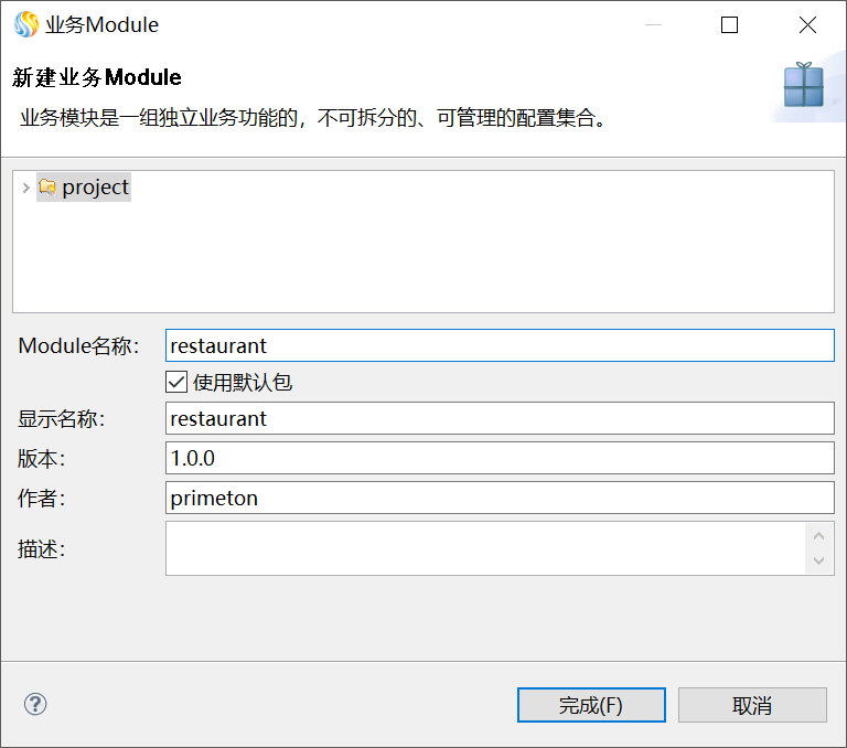 3. 单击“完成”,业务Module创建完成,如下图所示。