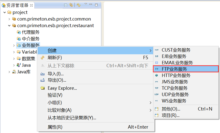 1. 在资源管理器中,在新建的业务Module“com.primeton.esb.project.restaurant”的“业务服务”上,鼠标右键选择“创建 > FTP业务服务”,如下图所示。