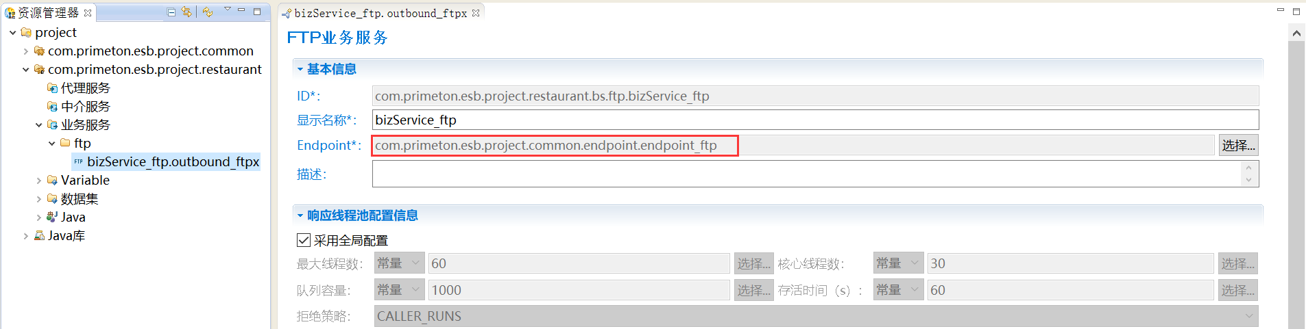 3. 单击“完成”,在打开的“FTP业务服务”的编辑界面中,需要选择Endpoint和填写URI信息,如下图所示。