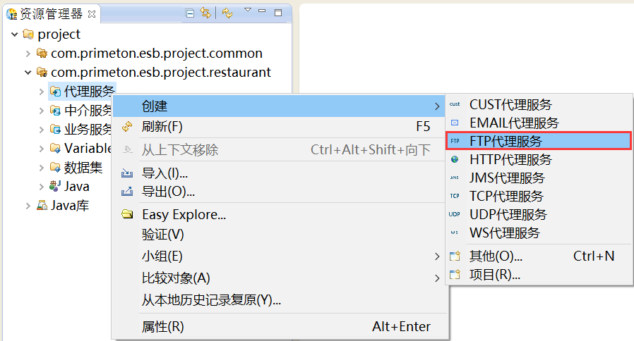 1. 在资源管理器中,在新建的业务Module“com.primeton.esb.project.restaurant”的“代理服务”上,鼠标右键选择“创建 > FTP代理服务”,如下图所示。