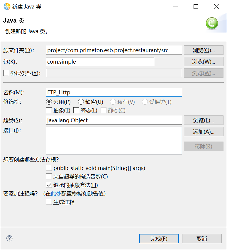 2. 完整的“FTP_Http”类代码如下所示,该类方法中涉及到ESB内部消息的封装,FTP协议转换成HTTP协议,http协议所需的参数都已列出。具体属性值,根据自己的情况而定。