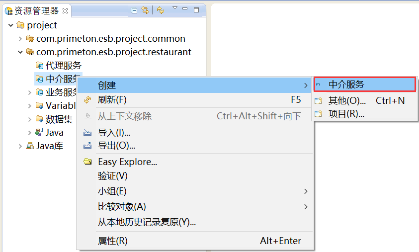 1. 在资源管理器中,在新建的业务Module“com.primeton.esb.project.restaurant”的“中介服务”上,鼠标右键选择“创建 > 中介服务”,如下图所示。