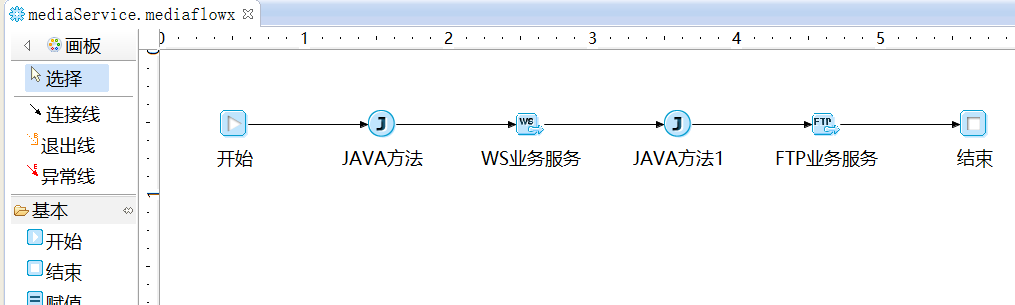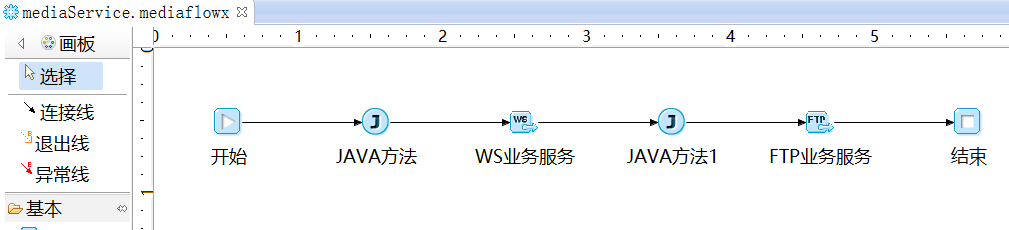 4. 在“中介服务”编辑界面,单击“服务编排”,从左侧面板拖入图元到右侧编辑界面,并用连线连接,如下图所示。