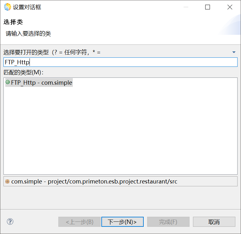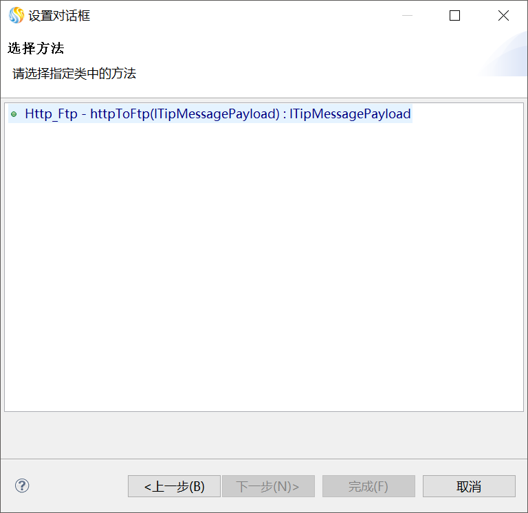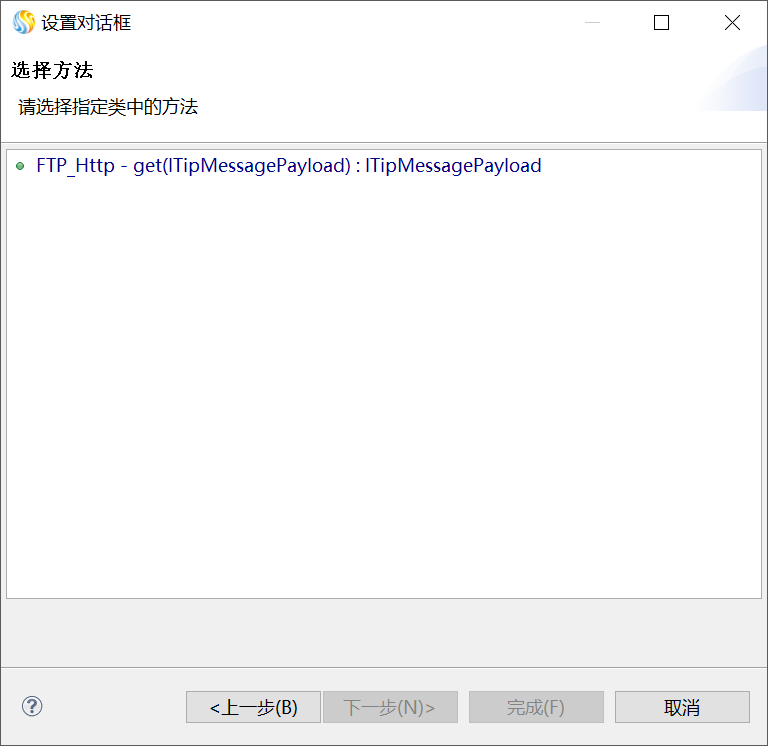5. 双击编辑区中的"JAVA方法"JAVA方法图元,在"JAVA方法属性设置"窗口中,单击"浏览...",弹出"选择java方法"窗口,在"选择要打开的类型的输入框中输入类名"FTP_Http",在"匹配的类型"中选中FTP_Http,单击“下一步”再选中方法,如下图所示。