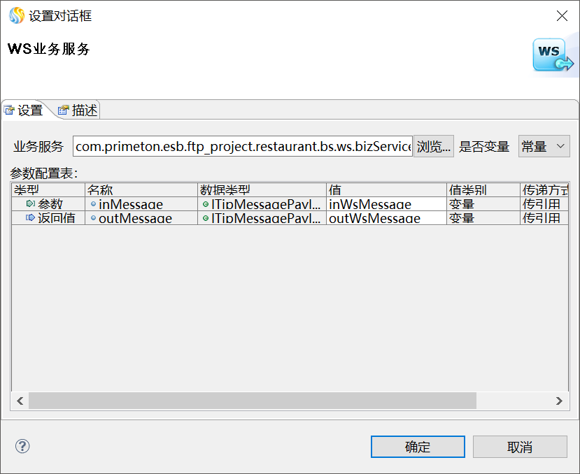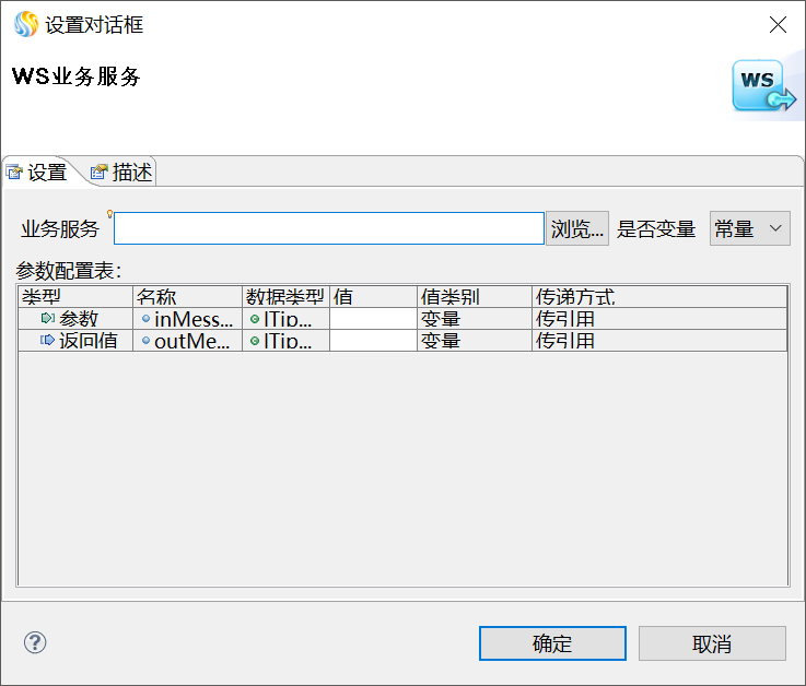 7. 双击编辑区中的"WS业务服务"图元,弹出WS业务服务的"设置对话框",单击"浏览...",如下图所示。