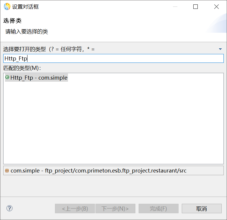10. 双击编辑区中的“JAVA方法1”图元,在"JAVA方法属性设置"窗口中,单击"浏览...",弹出"选择java方法"窗口,在"选择要打开的类型的输入框中输入类名"Http_Ftp",在"匹配的类型"中选中Http_Ftp,单击“下一步”再选中方法,如下图所示。