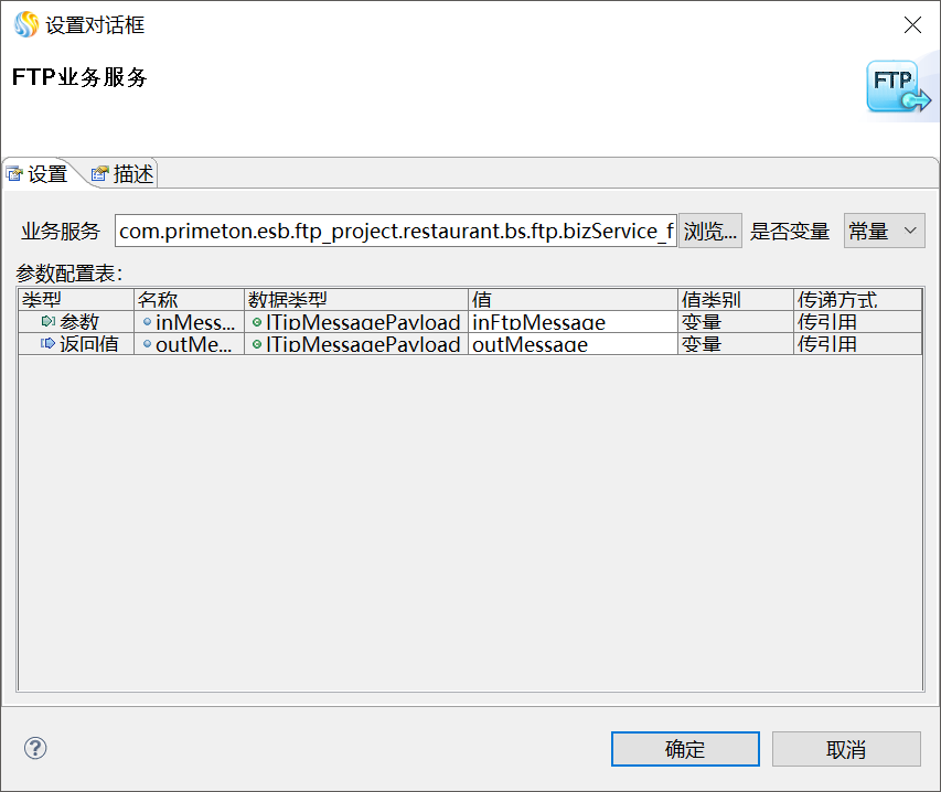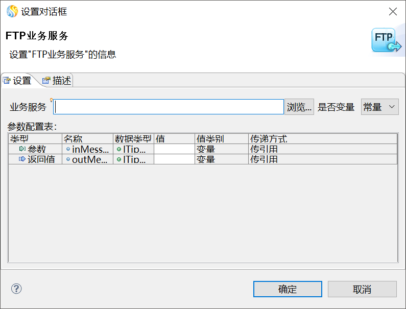 1. 双击编辑区中的"FTP业务服务"图元,弹出FTP业务服务的"设置对话框",单击"浏览...",如下图所示。