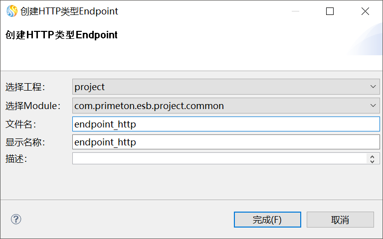 2. 在弹出的“创建HTTP类型Endpoint”界面,选择当前的工程、Module,并输入文件名及显示名称,如下图所示。