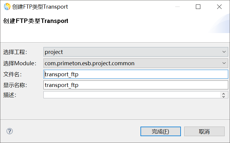 2. 在弹出的“创建FTP类型Transport”界面,选择当前的工程、Module,并输入文件名及显示名称,如下图所示。