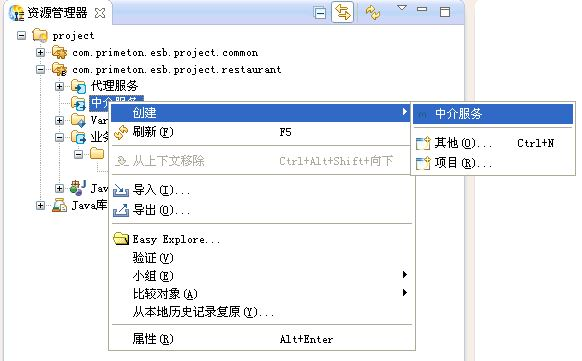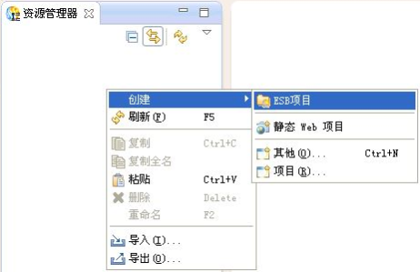 1. ESB Studio,在资源管理器中,点击右键,选择"创建->ESB项目"菜单项,创建工程,如下图所示。