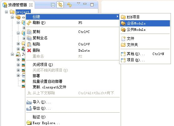 1. 在资源管理器中,选中project,点击右键,选择"创建->业务Module"菜单项,创建业务Module,如下图所示。