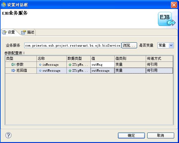8.双击编辑区中的"EJB业务服务"图元,弹出JMS业务服务的"设置对话框",点击"浏览..."按钮,选择刚创建的EJB业务服务。 9.在"设置对话框"中设置"参数配置表",并点击"确定"按钮,如下图所示。