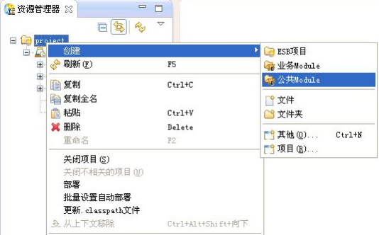1.在资源管理器中,选中project,点击右键,选择"创建->公共Module"菜单项,创建公共Module,如下图所示。