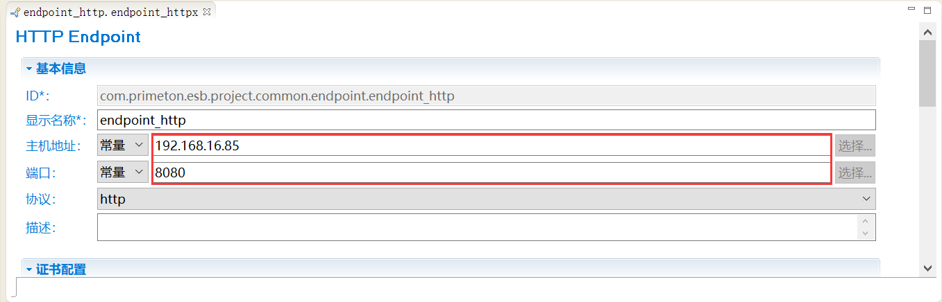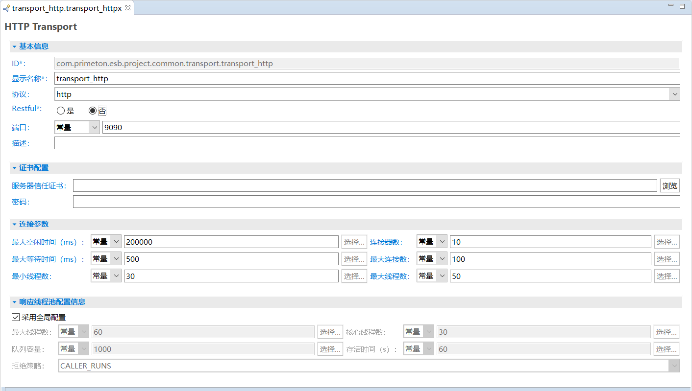 在资源管理器中,双击创建的HTTP Transport,打开HTTP Transport编辑器,修改相关参数。如下所示。