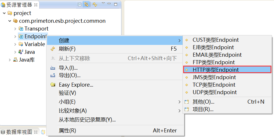 在创建的ESB项目的“Endpoint”上,右键选择“创建 > HTTP类型Endpoint”,如下图所示。