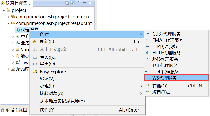 在资源管理器中,在新建的业务Module“com.primeton.esb.project.restaurant”的“代理服务”上,鼠标右键选择“创建 > WS代理服务”,创建WS代理服务,如下图所示。