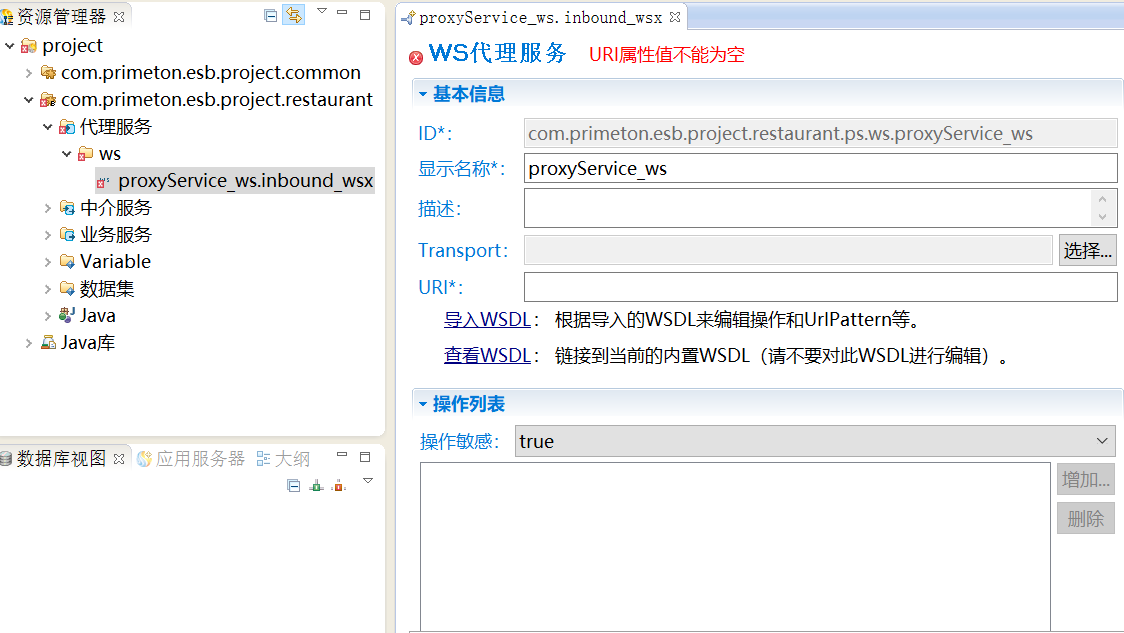 单击“完成”,在打开的“WS代理服务”的编辑界面中,需要选择Transport和填写URI信息,如下图所示。
