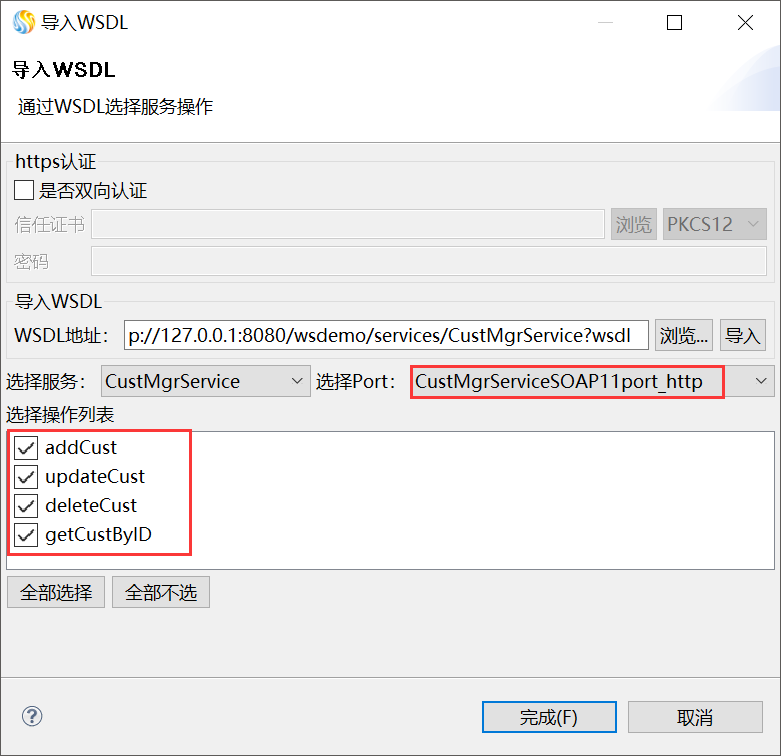 在“WS代理服务”的编辑界面,单击“URI*”下面的“导入WSDL”链接,弹出"导入WSDL"对话框。 在“WSDL地址”的输入框中输入WSDL地址:http://127.0.0.1:8080/wsdemo/services/CustMgrService?wsdl (opens new window) ,然后单击后面的“导入”,Studio会自动导入WSDL的相关信息,全部选择操作列表中的操作,最后单击“完成”,完成WSDL的导入步骤,如下图所示。