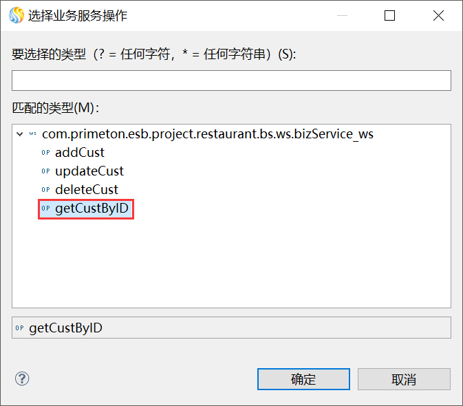 在“操作基本信息”区域,单击“服务名称”后面的“选择...”,弹出“选择业务服务操作”对话框,并选中“getCustByID”,单击“确定”,如下图所示。
