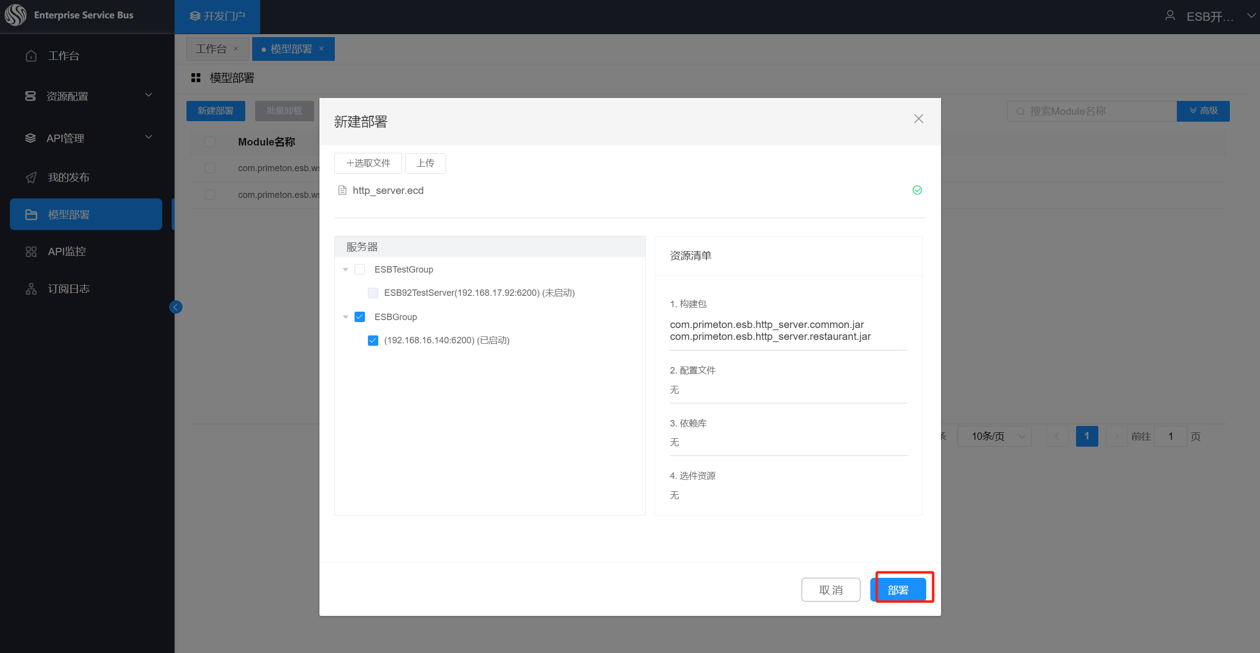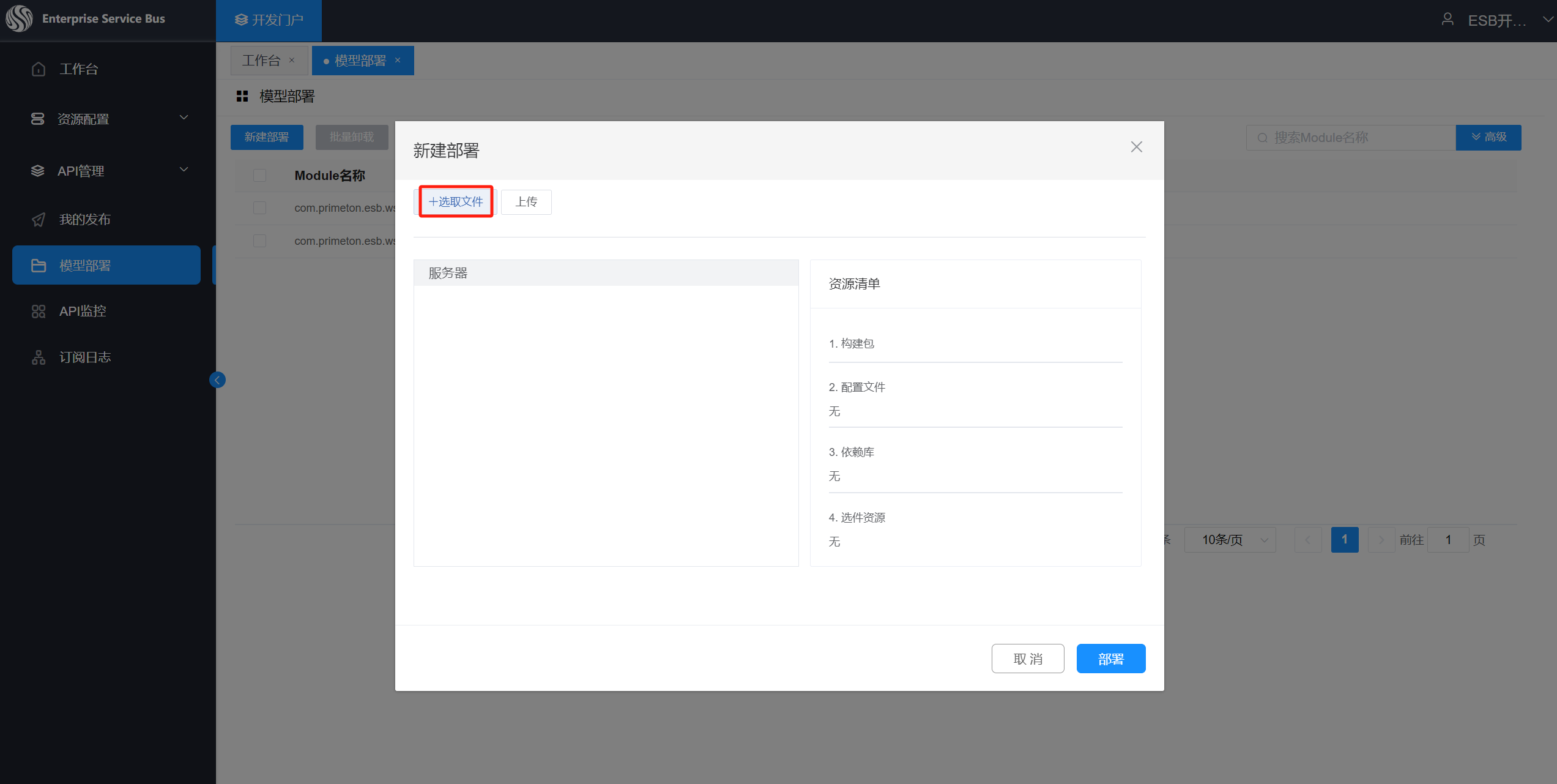 单击“新建部署“,显示新建部署页面,选取文件。