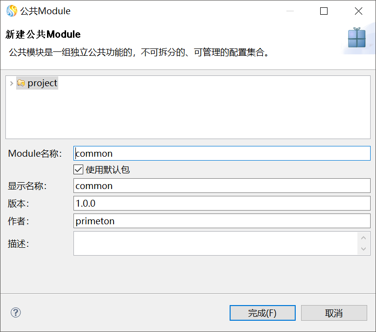 在“公共Module”对话框中,填写Module名称等信息,如下图所示。