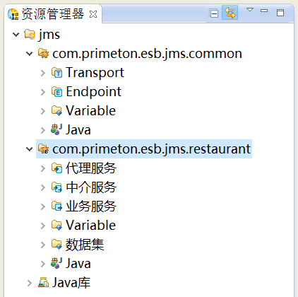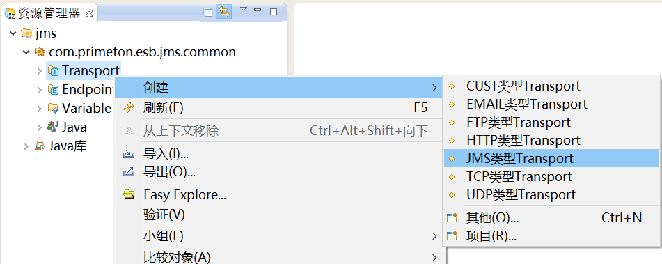 在创建的ESB项目的“Transport”上,右键选择“创建 > JMS类型Transport”,如下图所示。