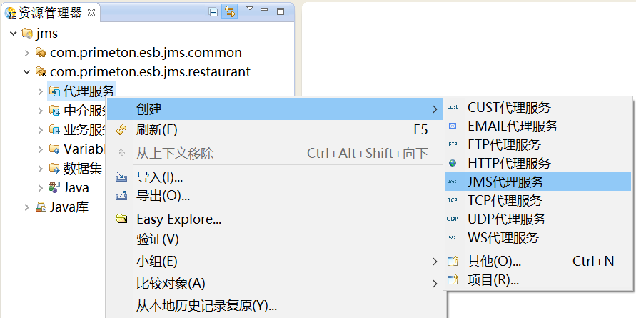 在资源管理器中,在“代理服务”上,鼠标右键选择“创建 > JMS代理服务”,创建JMS代理服务,如下图所示。