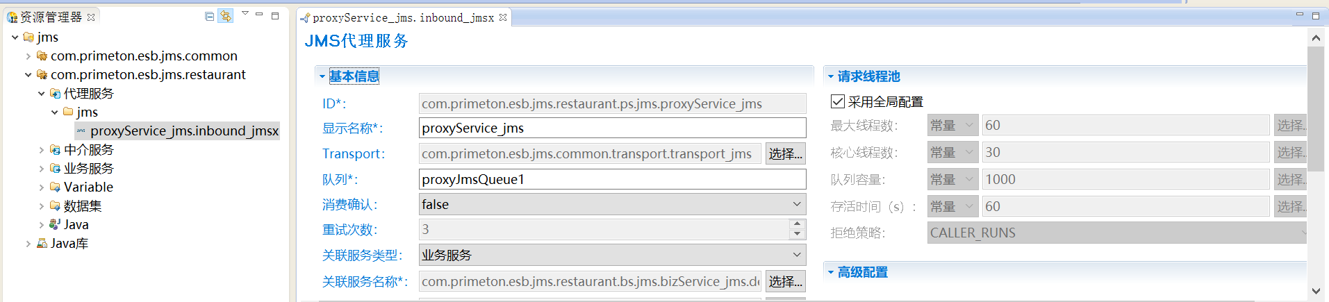 单击“完成”,在JMS代理服务的编辑界面中,设置JMS代理服务的配置,如下图所示。