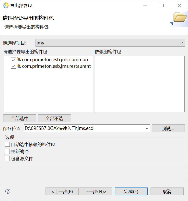在弹出的"导出部署包"窗口中选择这两个Module,并指定"保存位置",将部署包命名为jms.ecd,单击"下一步",如下图所示。