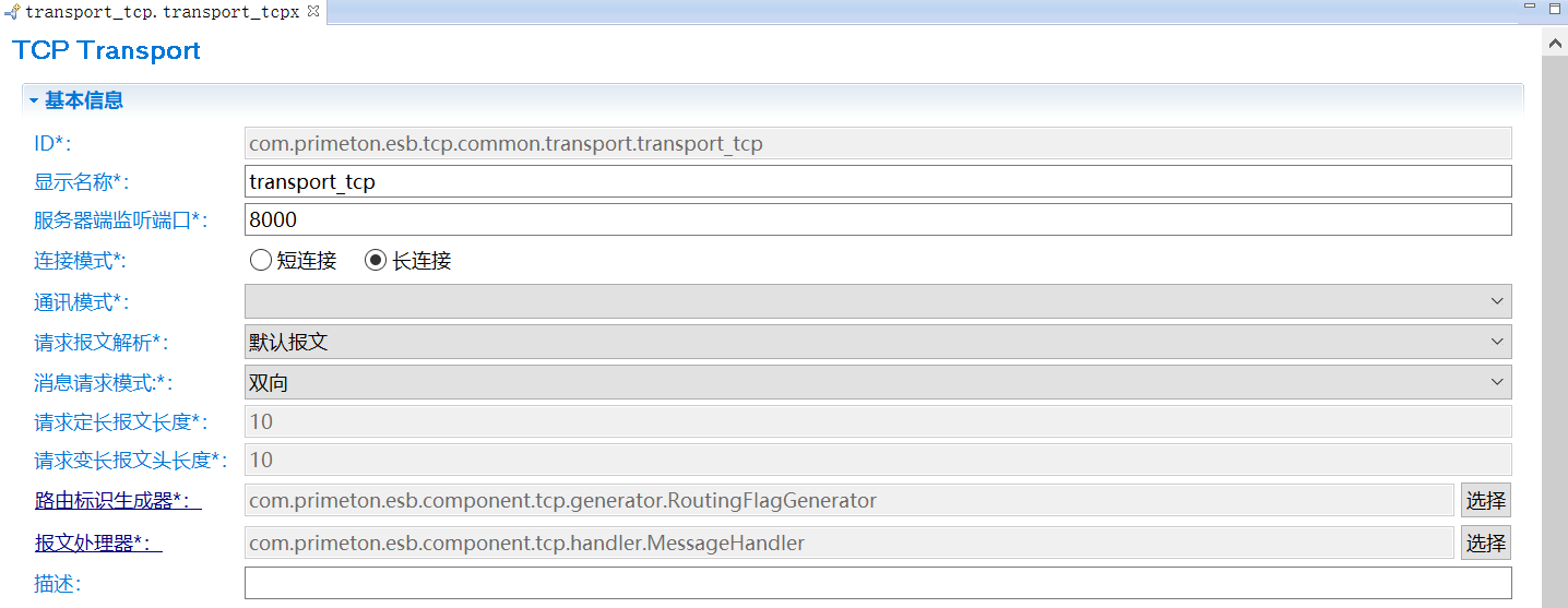 4. 在资源管理器中,双击创建的TCP Transport,打开TCP Transport编辑器,修改相关参数。如下所示。
