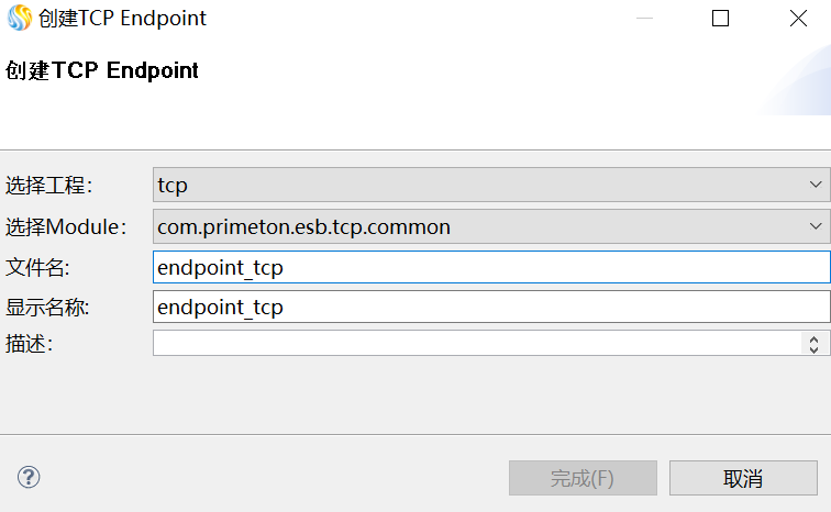 2. 在弹出的“创建TCP类型Endpoint”界面,选择当前的工程、Module,并输入文件名及显示名称,如下图所示。