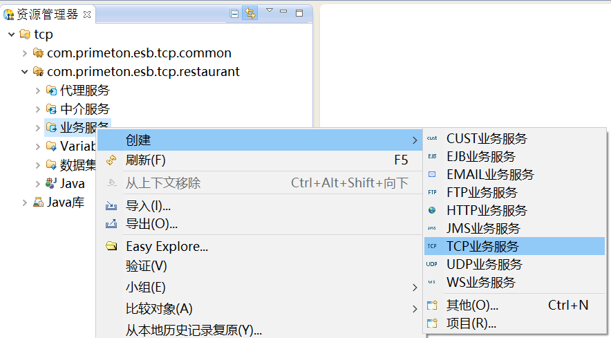 1. 在资源管理器中,在新建的“业务服务”上,鼠标右键选择“创建 > TCP业务服务”,创建TCP业务服务,如下图所示。