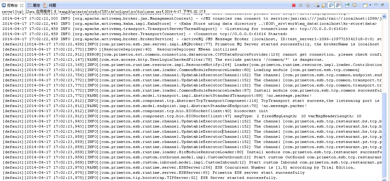 2. 部署完成后,ESB Studio将公共Module和业务Module部署Studio内置的ESB Server上,然后启动ESB Server,如下图所示。