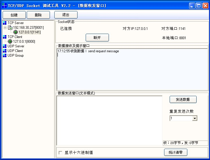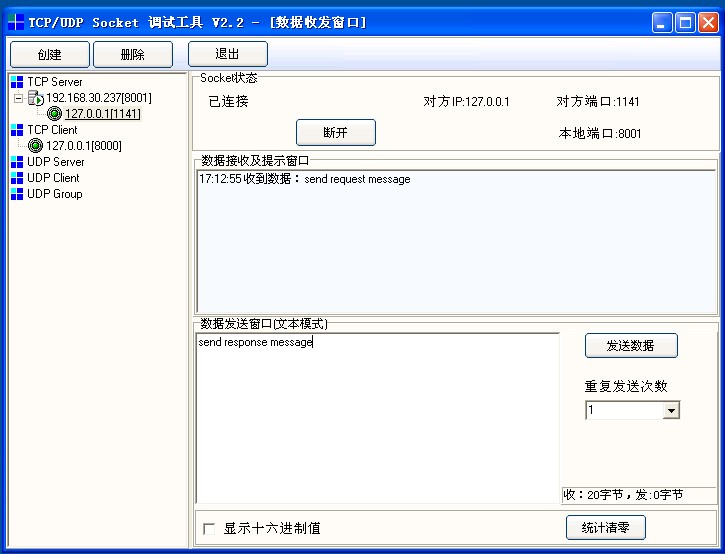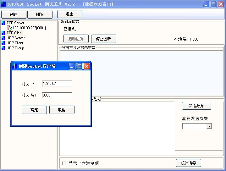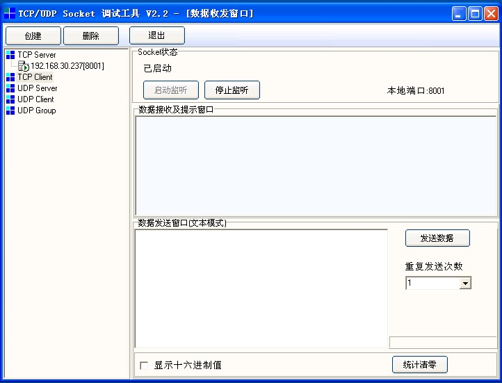 1.通过SocketTool进行测试,创建TCP Server,监听端口对应TCP Endpoint配置的端口8001;创建TCP Client,如下图所示。