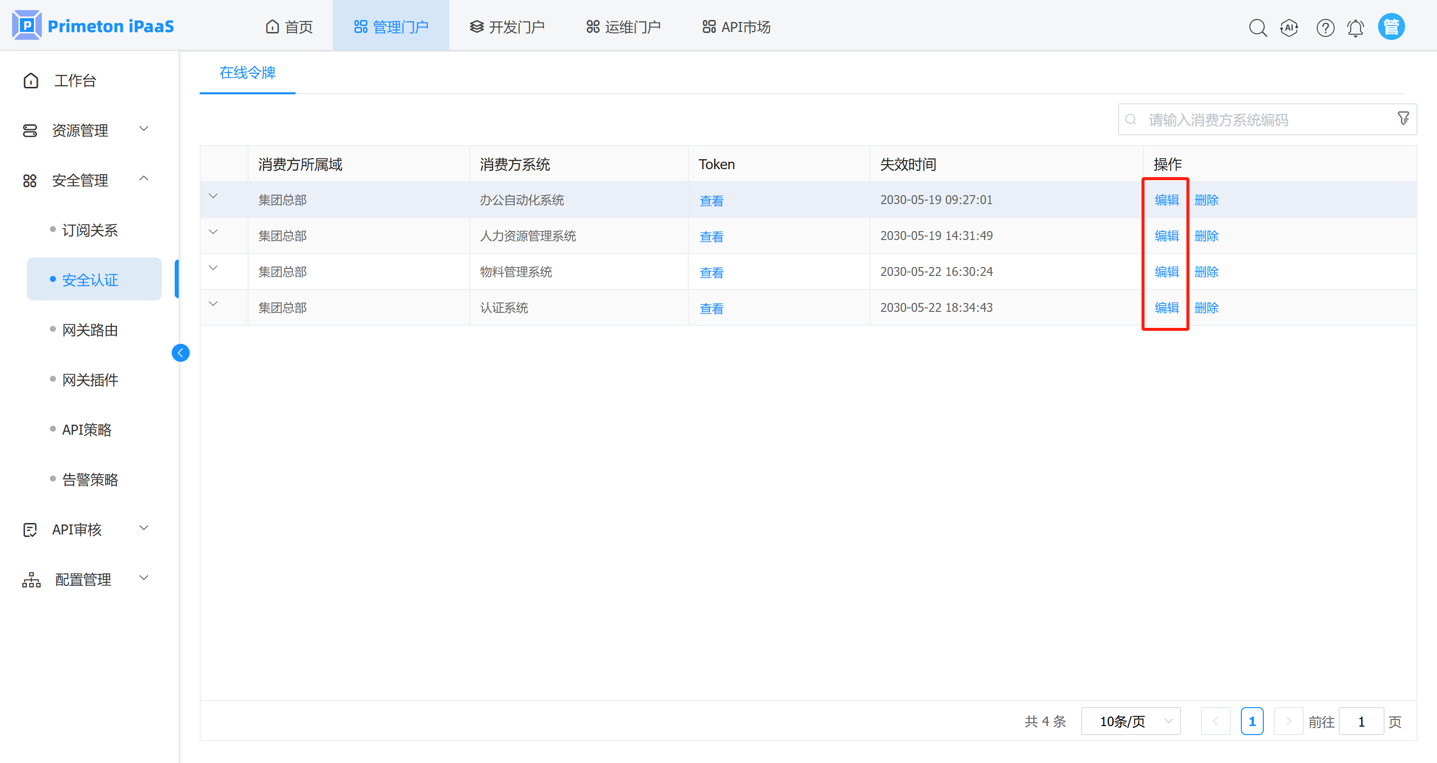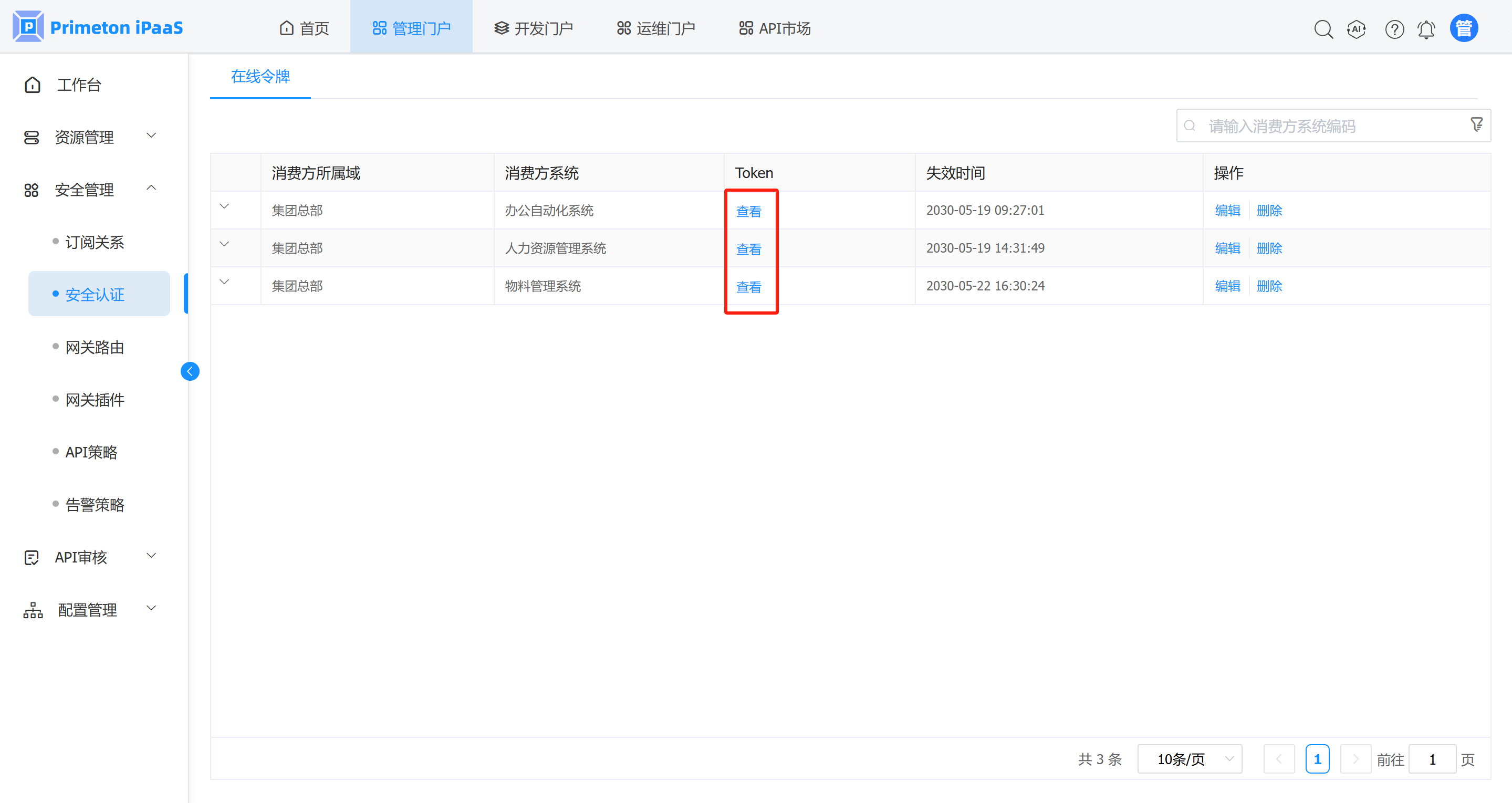 2. 完成第一步骤后,管理人员登录系统,进入管理门户,点击菜单“安全管理”>“安全认证”,可查看到所有系统的“在线令牌”记录。