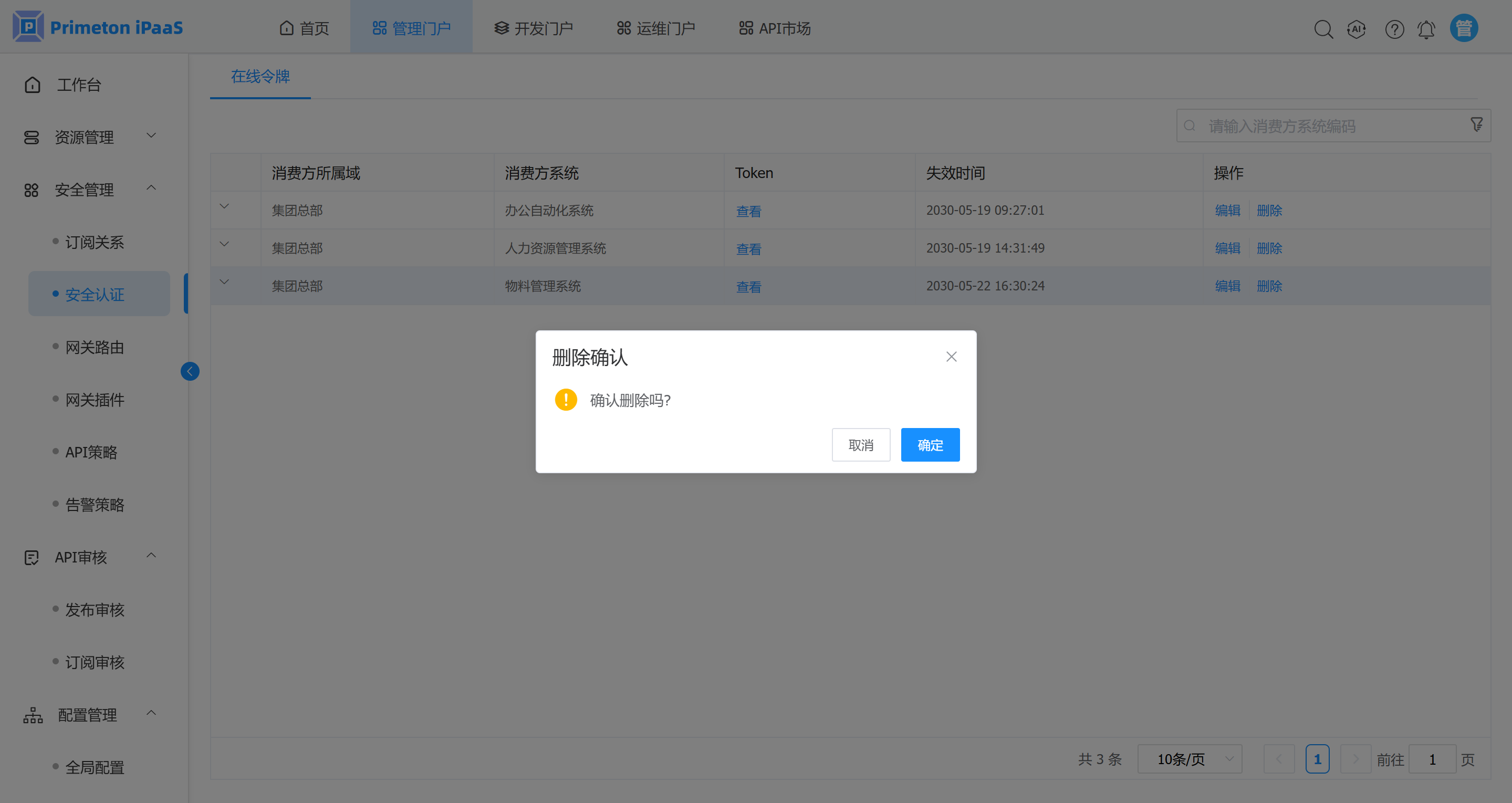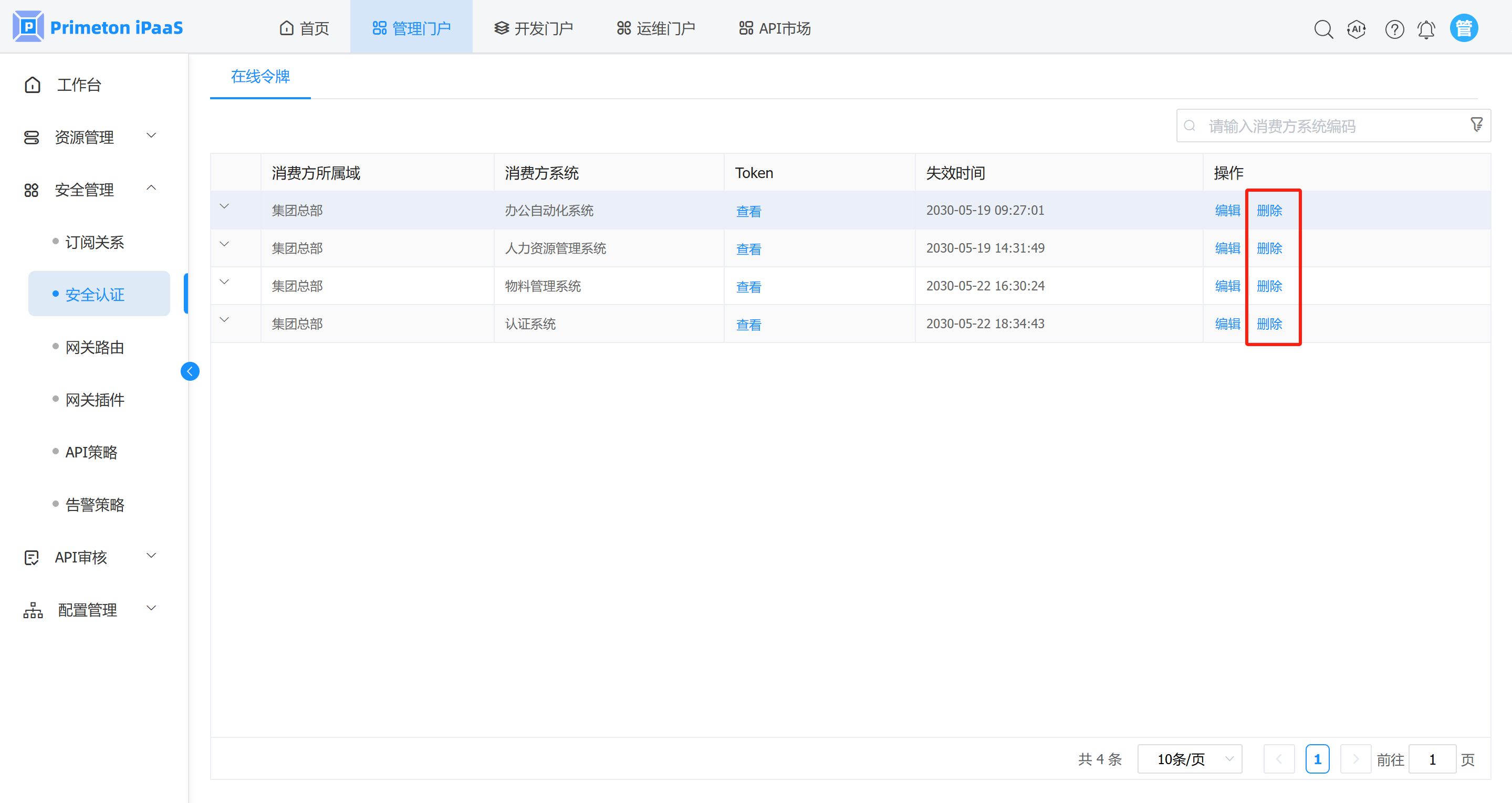 2. 确认需要删除的系统没有订阅关系后,点击菜单“安全管理”>“安全认证”,打开安全认证页面,可看到操作列有“删除”按钮。