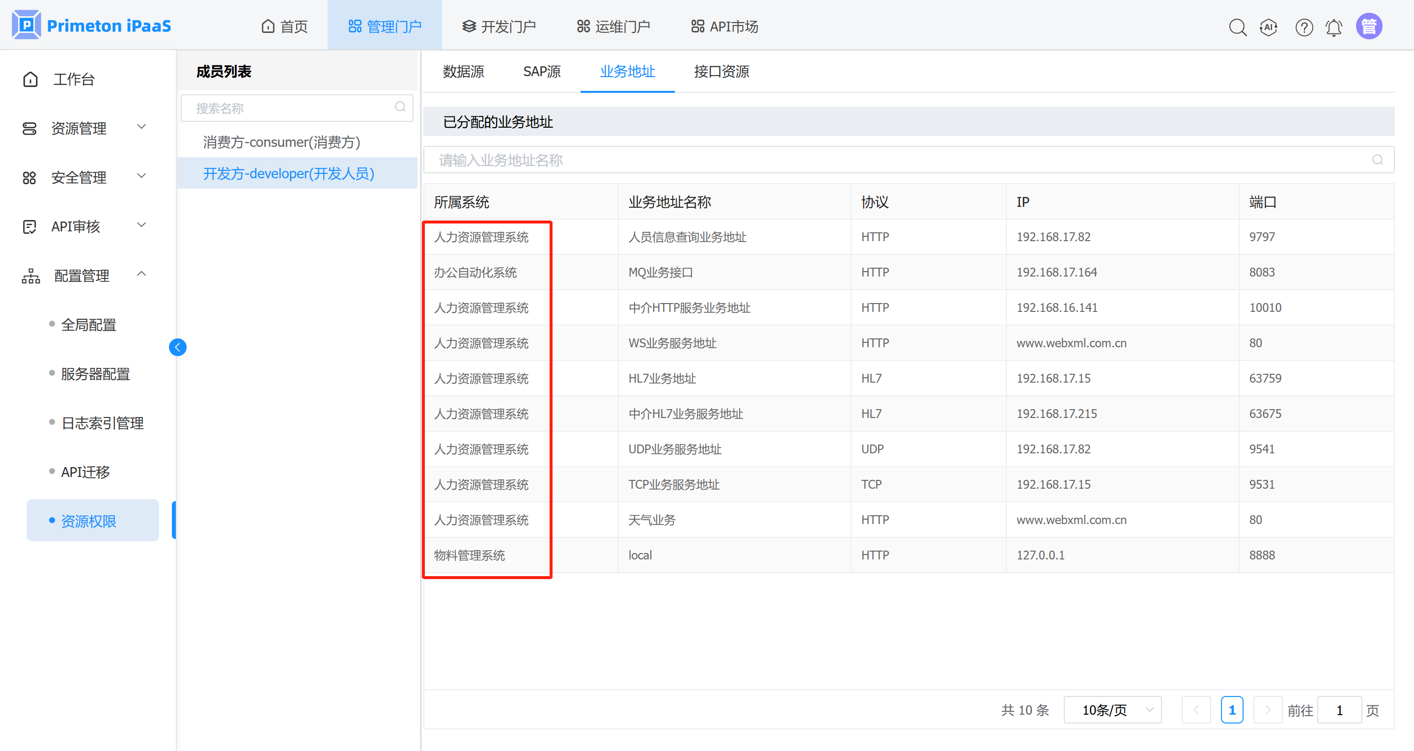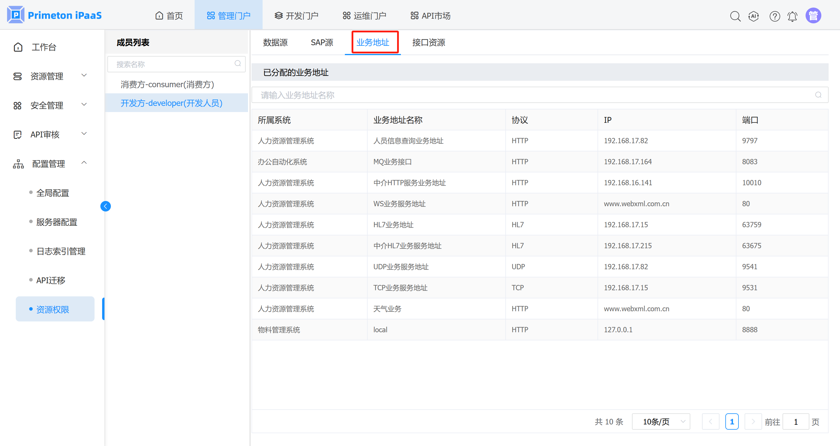 管理人员登录系统,进入管理门户,点击菜单“配置管理”>”资源授权“,进入资源授权界面,左侧展示成员列表,右侧展示数据源、SAP源、业务地址、接口等资源授权页签。