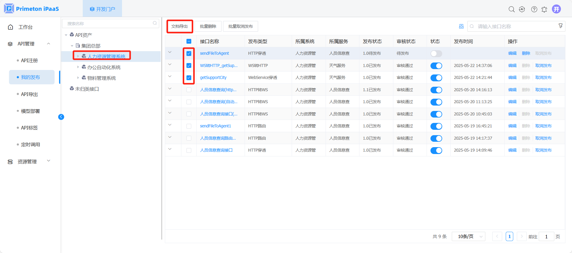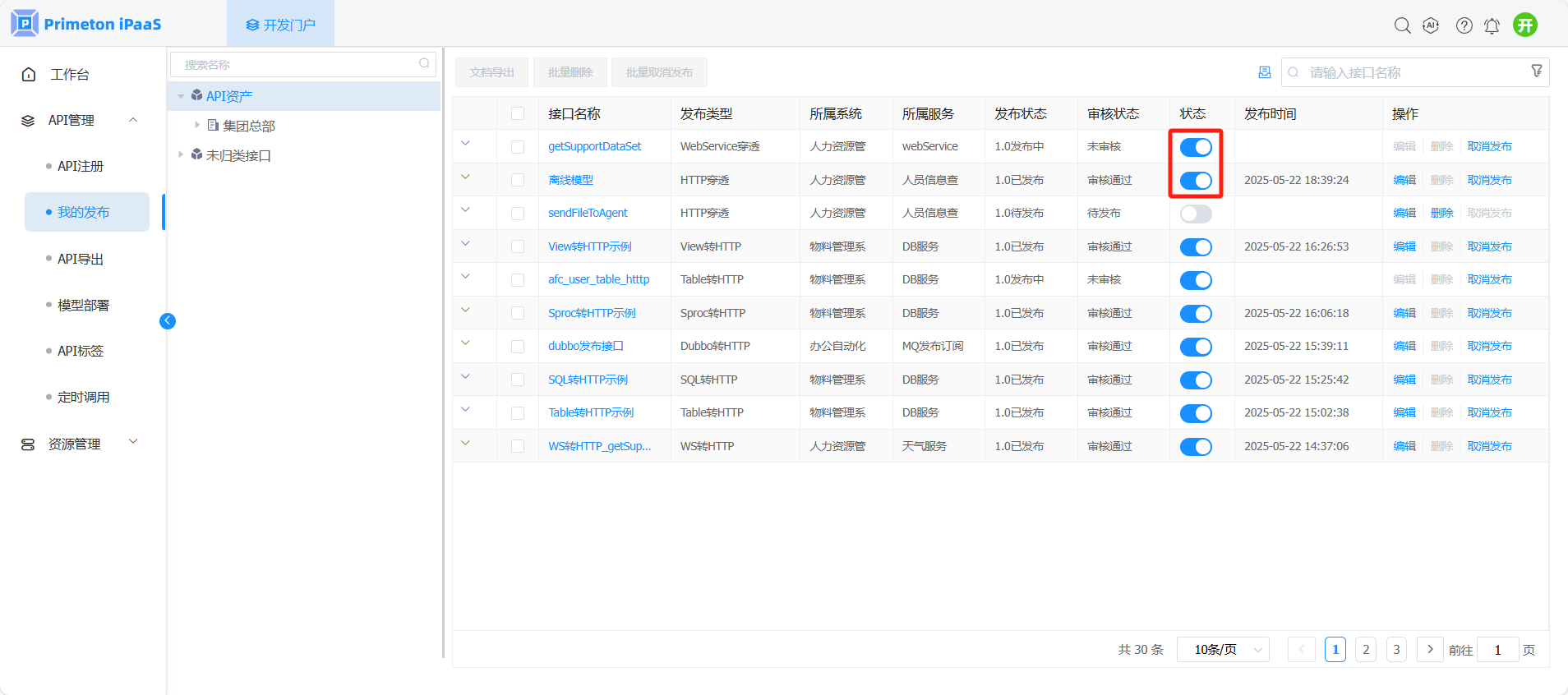 2. 在“我的发布”界面,选择左侧组织树中API所属节点,选择需要上线的API发布记录,点击该记录状态列的开关按钮,上线接口。