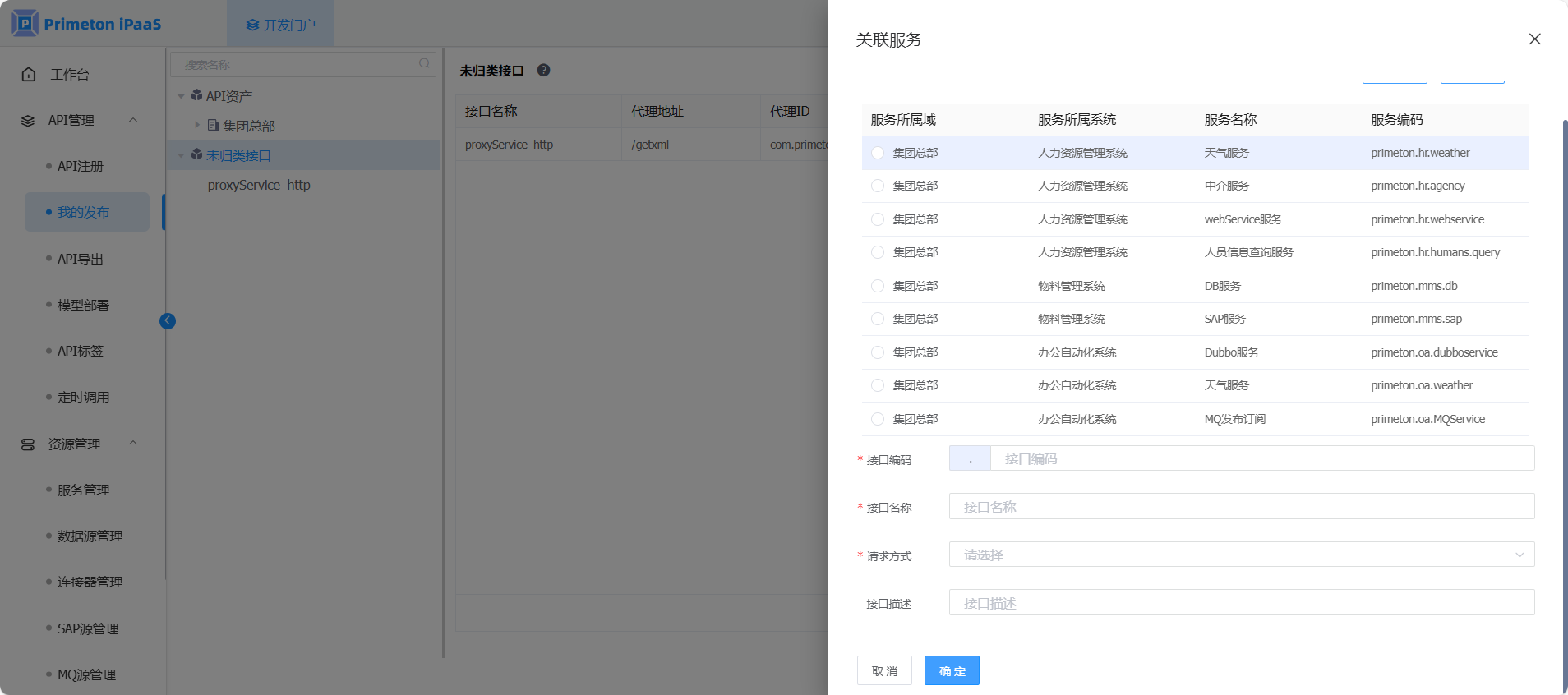 3. 在“开发门户 > API管理 > 我的发布“页面,在未归类接口类别中,选择记录点击操作列“关联服务”按钮,打开关联服务界面。