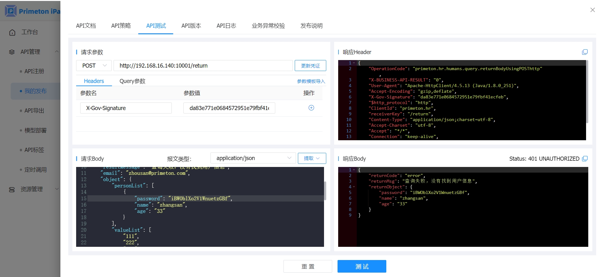 2. 在“接口详情”页面,进入“API测试”页签,按业务接口的需求,填写访问配置项,点击“测试”按钮,进行接口测试。