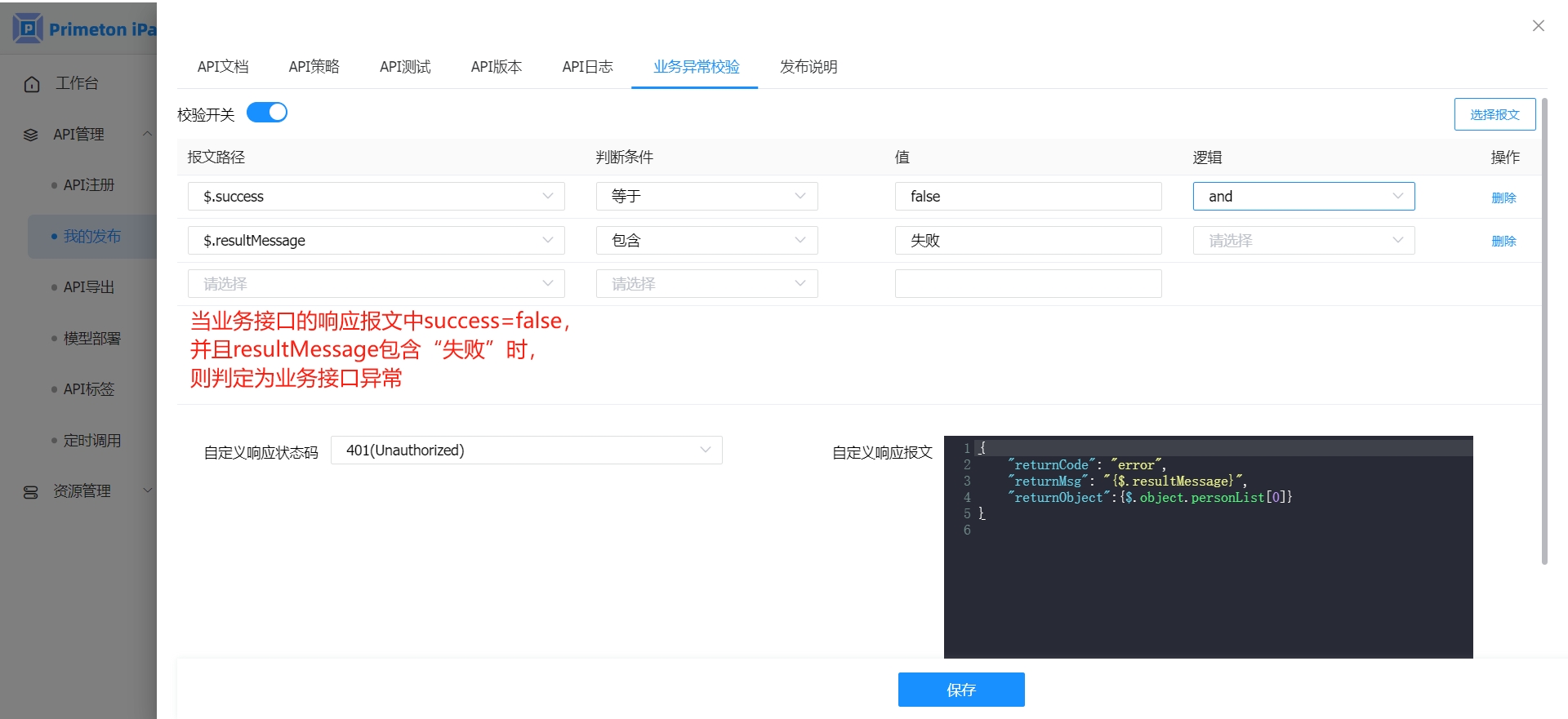 4. 业务异常校验支持自定义响应状态码和自定义响应报文,当业务接口的响应报文被判定为业务异常时,如果用户配置了自定义响应状态码和自定义响应报文,则返回自定义响应状态码和自定义响应报文,没有配置则返回原状态码和原报文。
