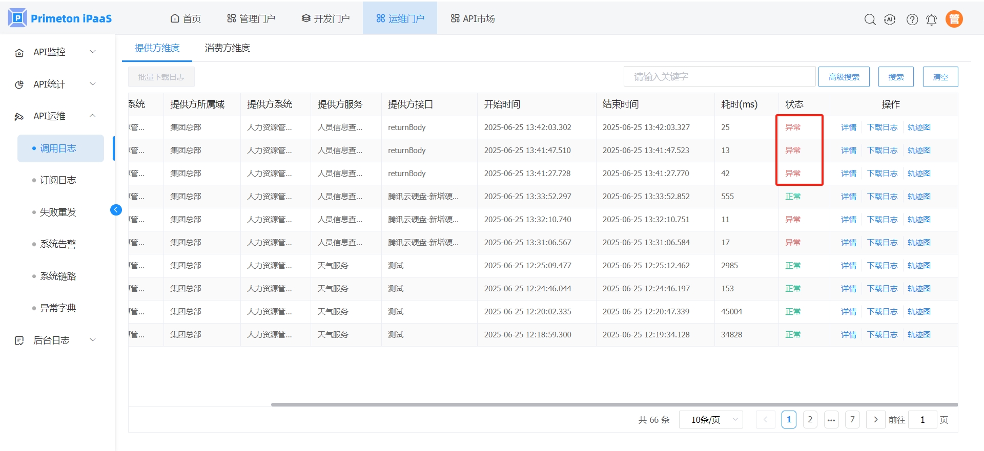 3. 业务异常校验会根据用户配置的条件判断是否属于业务异常,当业务接口的响应报文符合判断条件时,认为是业务异常,调用日志记录的状态是“异常”,如下所示: