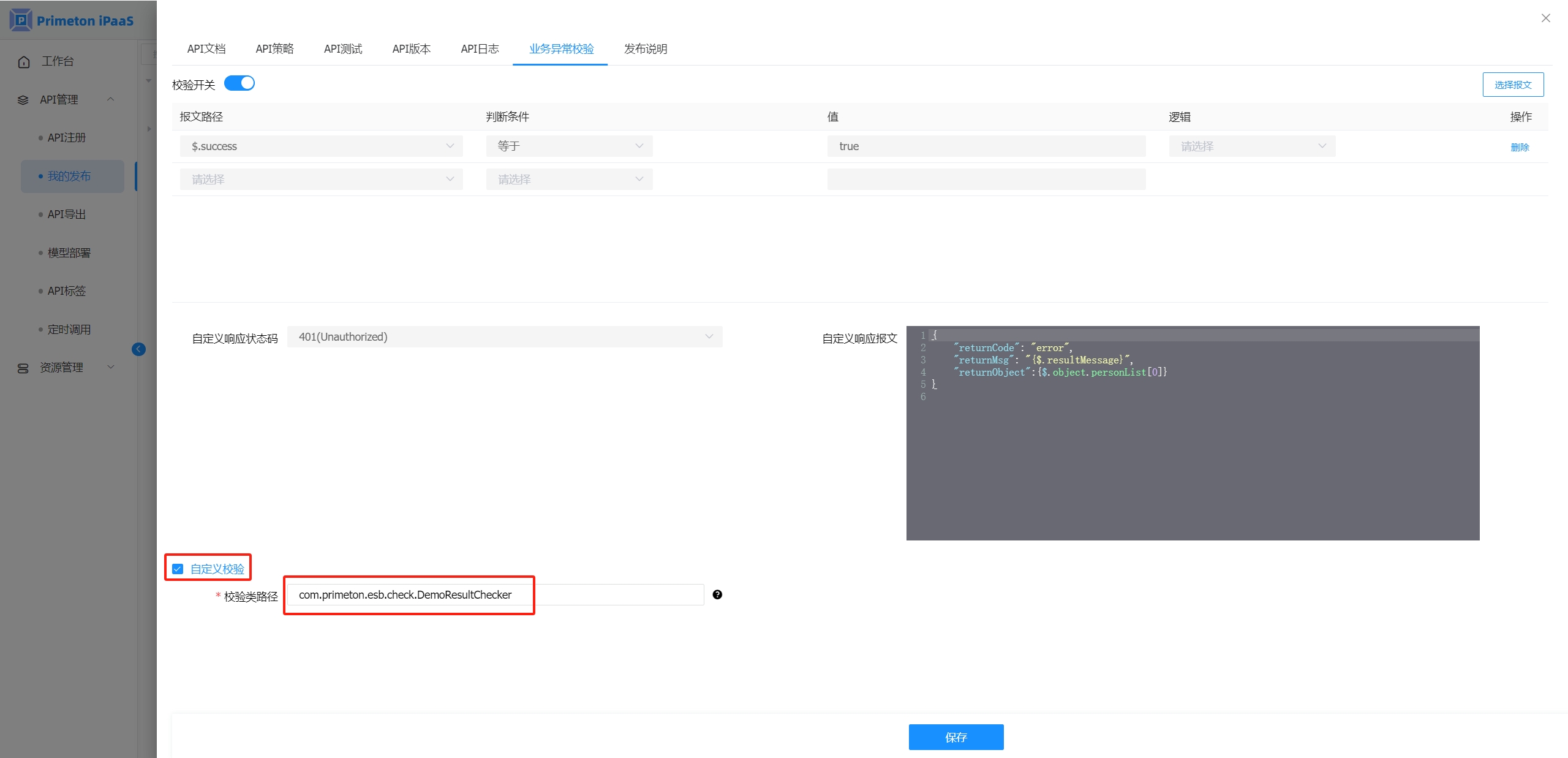 6.5 在业务异常校验配置页面,开启自定义校验,在校验类路径填写自定义业务异常校验类的全类名。